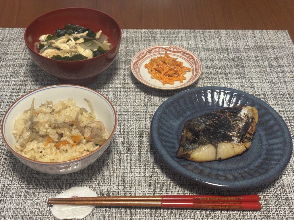 ここで昨日さいておいた鶏むね肉が活躍。スープに入れてしまい、手軽にたんぱく質がとれる1品が完成!そして作り置きと炊き込みご飯、冷凍の焼き魚を焼くだけ。