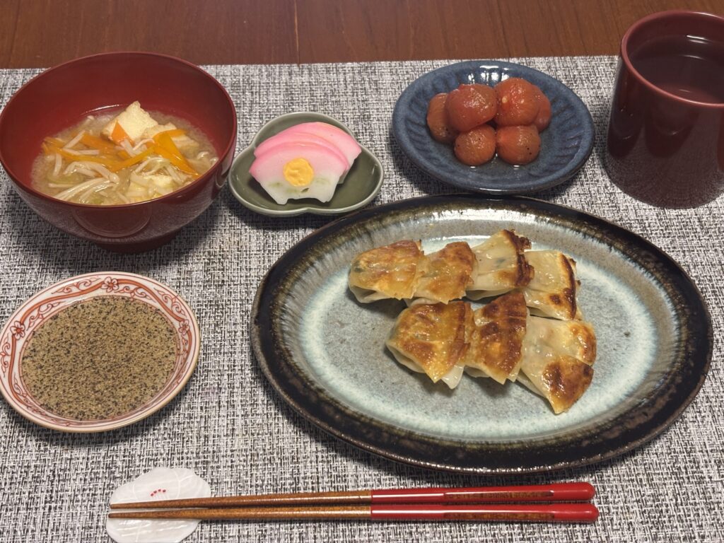 この日は夫が外食の日。週に1回はどこかでお鍋系のものを取り入れています。生協の水餃子に冷凍していた野菜や冷蔵庫の余りを入れて1品完成。残りは作り置きの副菜を添えるだけ。スープは少し多めに作って翌朝も食べられるようにしています。